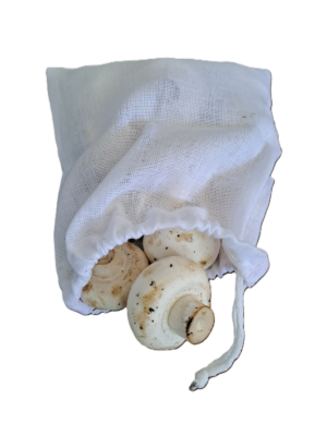 A breathable 100% cotton cheesecloth bag (18 × 18 cm) with a secure drawstring closure. Food safe, reusable, and perfect for keeping herbs and vegetables fresher for longer in the fridge.
